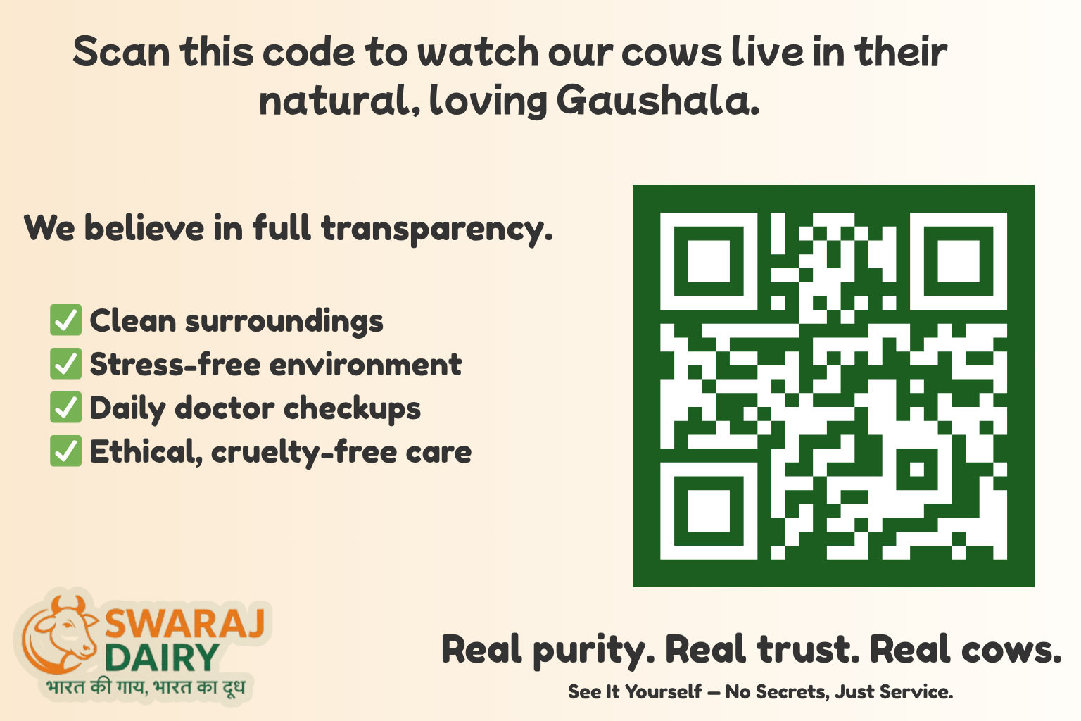 Most people never see what happens behind factory dairy systems. At Swaraj Dairy, we do things differently — with compassion, care, and complete transparency: